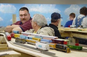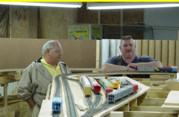 | Frank Dublin & Steve Gohman discuss the layout from Smithville | "Bumper" Clayton & Frank at Smithville - notice the "staged" trains without track |