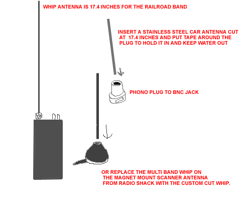 four inches cut off the whip for the RR frequencies, is your best bet.