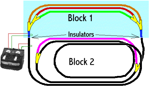 Blocks are sections of track that are independently controlled. They are isolated from the rest of the track using track pins made of wood or plastic (insulators). Block allow you to control a trains speed and direction when it is on that section of track. Because they allow you to speed up or slow down a train, to avoid a collision, you are able to operate more than one train on your layout. Switches (Turnouts):