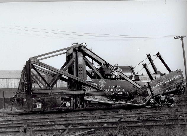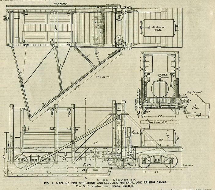 These spreaders were the first commonly used type of Jordan. They were called Knuckle Braced machines as they used a new type of wing brace, that was articulated in the center, acting like a knuckle. To change the spread angle though, one still had to unbolt the braces, and telescope them in or out. This spreader featured an all steel construction, and a nose plow. This nose plow was raised and lowered vertically for use in spreading ballast and light snow removal, as well as ripping ice when the ice cutters were installed. The original models featured a fixed diagonal brace. In 1919 a 12" air cylinder was added, allowing quick, in cab control of the diagonal brace. Some early literature have referenced this as a Model A (not to be confused with the Type A). This line of spreaders used air cylinders to provide vertical movement to the nose plow, wing opening cylinders, vertical post cylinders and the diagonal braces (post 1919).
