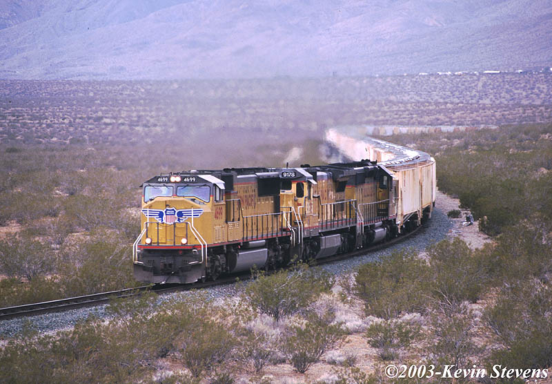 A train bound for the Trona Railway junction at Searles is shown crawling uphill North of Cantil.