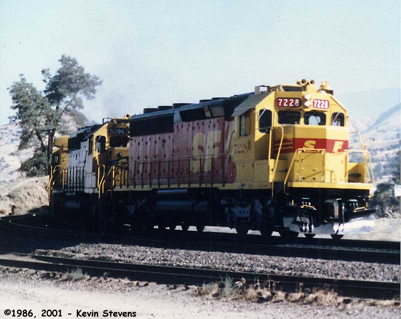 An eastbound Santa Fe freight led by SD45-2 #7228 nears the east switch of Walong siding. Santa Fe renumbered their rebuilt SD45-2's into the 5800 series when the merger was denied, making the 7200 series very short lived.