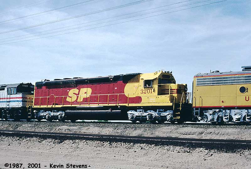 More than 13 years after the denial of the merger which created it's colors, SP SD40R #7357 still wears the ill-fated SPSF image. Although nearing 20 years since it's last major rebuild and 35 years since being built, this unit still earns it's keep for new parent Union Pacific every day. It spent a couple of weeks in October of 1999 in captive duty hauling general merchandise back and forth over Tehachapi Pass. With UP's new power orders, 7357 and other older power will probably find themselves out of a job soon.