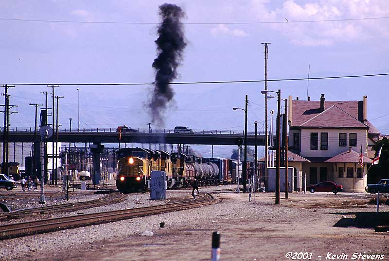 After changing crews in front of the ex-SP Bakersfield Depot, a Roseville bound UP train leaves a cloud of diesel smoke behind to mark its departure.