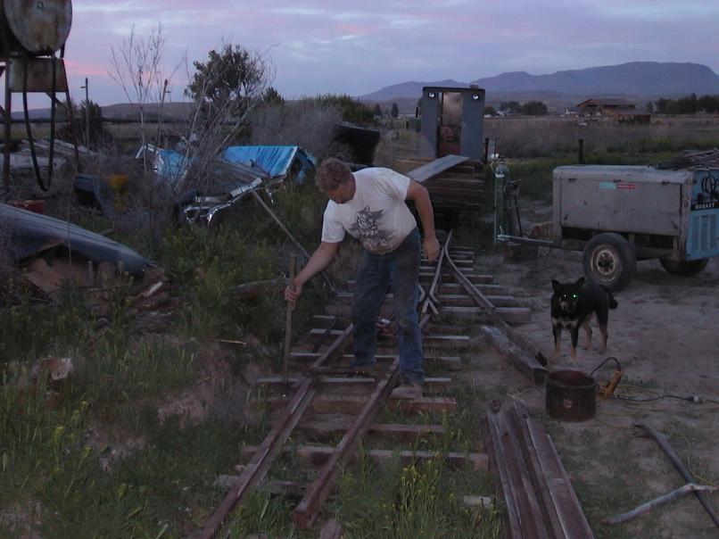 Back at it on Saturday night the 12th of May. The compromise joint on the #2 engine house track is progressing. Notice how interweaved our ties are near the switch. At 4' long they are longer than 'scale', reduce the need for switch length ties and stabilize the track well on our sometimes soggy ground. We only need four longer ones for each switch. Also note that we had to build all the 35 pound track in straight sections, attach it with heavy joints and curve it after it was attached.