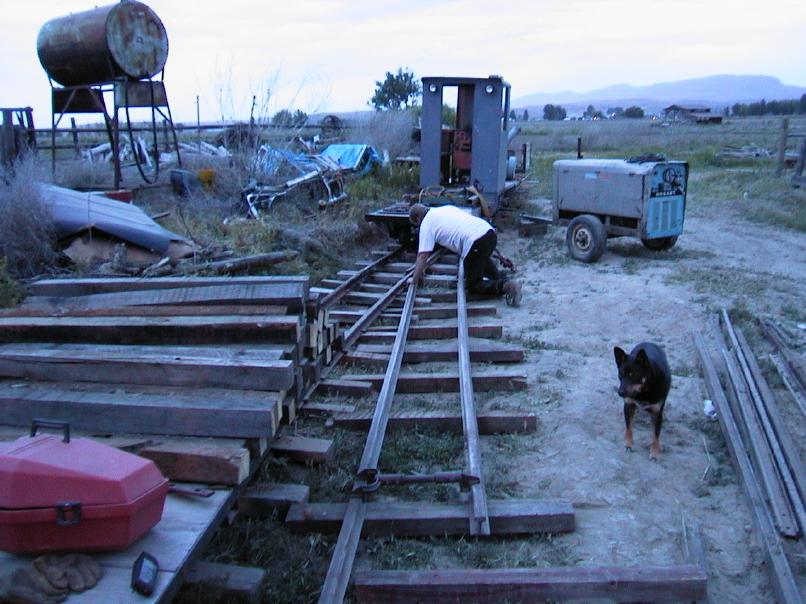 Rollie is pre-drilling spikeholes in the 4x4 ties. We use old standard gauge spikes. Though they stick about 2" out the bottom of the ties, they are cheap and once driven over with the loco,stay in place exceptionally well (you have to lift the track to move it a couple of inches, trust us, we know about this!)