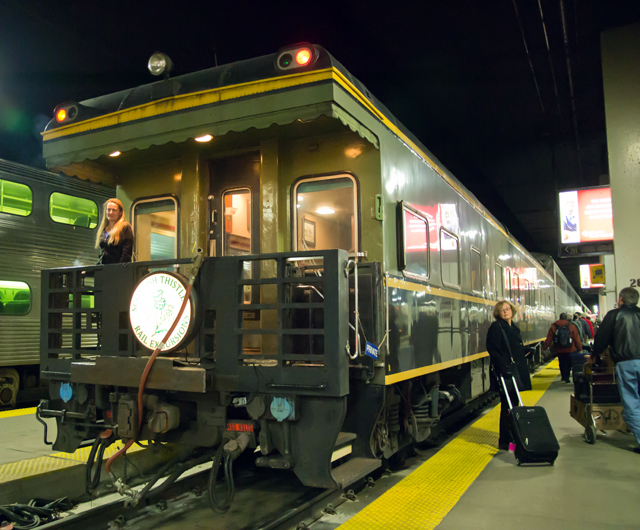 ![]() The 19th century Baltimore & Ohio roundhouse at Martinsburg, W. Va., photographed one cold February evening from the lounge car of a westbound Capitol Limited. trainweb.us/henrykisor Comments welcomed at Here The good old Cap, however, can still surprise me. When my wife, Debby, and I boarded No. 30 at Chicago Union Station one day in February, we had a nice view of a private car, the Scottish Thistle, coupled onto the rear of the train. Of course I wanted to board her, but reality took us way up to the front where our sleeper awaited. ![]() They also wait who ride: A family snoozes in Chicago Union Station's Metropolitan Lounge. ![]() "No, Henry, you can't get aboard this private varnish," Debby seems to be declaring as we roll our bags up to the Capitol Limited's sleeping cars deep in Chicago Union Station. There the attendant, Darrell, lifted our tickets at the door of the car as we boarded. When we reached our roomette on the second level, we discovered that Darrell had lifted the return tickets—the wrong ones. Downstairs we went. "My mistake!" Darrell groaned when we showed him the tickets, and he reached into his pockets. "So long as you have both parts of the ticket, you'll be okay." Back up in the roomette we checked the tickets again. This time they belonged to somebody else. Downstairs we went again. "I really messed up!" Darrell said. He dug deep and finally found the correct tickets. His forthrightness was welcome—sometimes Amtrak on-board crew try to blame their own blunders on passengers—but the error was not an auspicious start to our trip. Half an hour later in the dining car, I had all but forgotten the incident. Since I'd last traveled aboard the Cap in November, 2010, Amtrak had upgraded the car to "Enhanced Dining Service," meaning meals are served on china and glass, not plastic crockery, and with genuine napery. The controversial "Cross Country Cafe" car with banquette seating at one end and a lounge at the other was gone. In its place was a conventional dining car so recently refurbished that the interior looked spanking new.Two service attendants and a lead service attendant (as Amtrak calls its waiters and stewards) attended the passengers, instead of one steward and one waiter as before. Best of all, our chef seemed to have mastered the techniques of sous-vide cookery, the French technique in which dishes are partially cooked and quickly vacuum-frozen off the trains, then finished aboard in convection ovens. The top sirloin coulotte steak, tender and tasty, was the best cut of beef I've ever had on Amtrak, right up there with the fare at metropolitan Midwestern steak houses. The baked potato was firm, the way I like it, and the stringbeans not too watery. As for the train's signature Maryland crab cakes, our dinner companion, a retired physical education teacher from Moline, Illinois, pronounced them excellent. She was both widely traveled and a train lover, and confided that she and her husband were planning to celebrate his upcoming 75th birthday aboard the storied Glacier Express in the Swiss Alps. For dessert Debby and I split a chocolate tiramisu parfait and a citrus-berry-white chocolate torte, both first-class. After dinner a few miles east of Elkhart, Indiana, the train stopped. And waited. And waited. I looked out the window, and a long freight on the westbound track was also stopped. Soon the conductor announced helpfully over the PA system, "There has been an incident outside the train." Well, yeah . . . Soon someone said, "Mechanical problem." That set me to fretting. If the Cap leaves Cleveland very late in the night, passengers might be "bustituted" from Pittsburgh to Washington and points between. About ninety minutes after the train stopped, Darrell announced, "We hit a horse. As soon as they clean up the mess, we'll go." "We hit a horse?" someone called. "We hit a horse?" I turned in and slept fitfully, waking often to see if we'd reached Pittsburgh yet. In the morning the lead service attendant explained everything. An Amish horse towing a buggy had been spooked by the noise of a westbound freight and had dashed across a grade crossing. At considerable speed the freight locomotive struck the horse, which bounced across the crossing right into the lead engine of the eastbound Capitol Limited. No one, thankfully, had been aboard the buggy. The attendant had no other details, such as how the horse escaped its owner, or where they had been when the freight announced its presence. We were sorry for the horse but glad no human life had been lost. At breakfast the scrambled eggs were done perfectly, and the pleasant woman across the table was interesting in an unusual way. She was a horseplayer, part-time racetrack employee, and mother of a racehorse breeder. She needed a new pickup truck ("all those bales of hay") and discoursed learnedly on the choices available to her. ![]() The Casselman River near Addison, Pa., greets early-morning diners. Usually a thick green screen of leaves obscures views of the various rivers, but this was a cold February morning. ![]() This must be a foamer's house: a cabin constructed in the shape of a caboose on a knoll near Meyersdale, Pa. ![]() The old Western Maryland Railroad's 2,000-foot Salisbury Viaduct, built in 1912, over the Casselman Valley near Meyersdale. ![]() This group of Plain People in the lounge car are probably Mennonites, several sects of which live along the old Baltimore & Ohio route in Pennsylvania, Ohio and Indiana. ![]() Generally Plain People do not like to be photographed, but I felt a lot less intrusive when this young woman suddenly pulled out a digital camera and herself snapped photos inside and outside the lounge car. Some sects evidently are more modern than others. ![]() Harper's Ferry, W. Va., is the prettiest of the historic towns along the old B&O. Debby and I spent the rest of the morning in the lounge car enjoying the scenery on the Youghiogheny, Casselman and Upper Poto