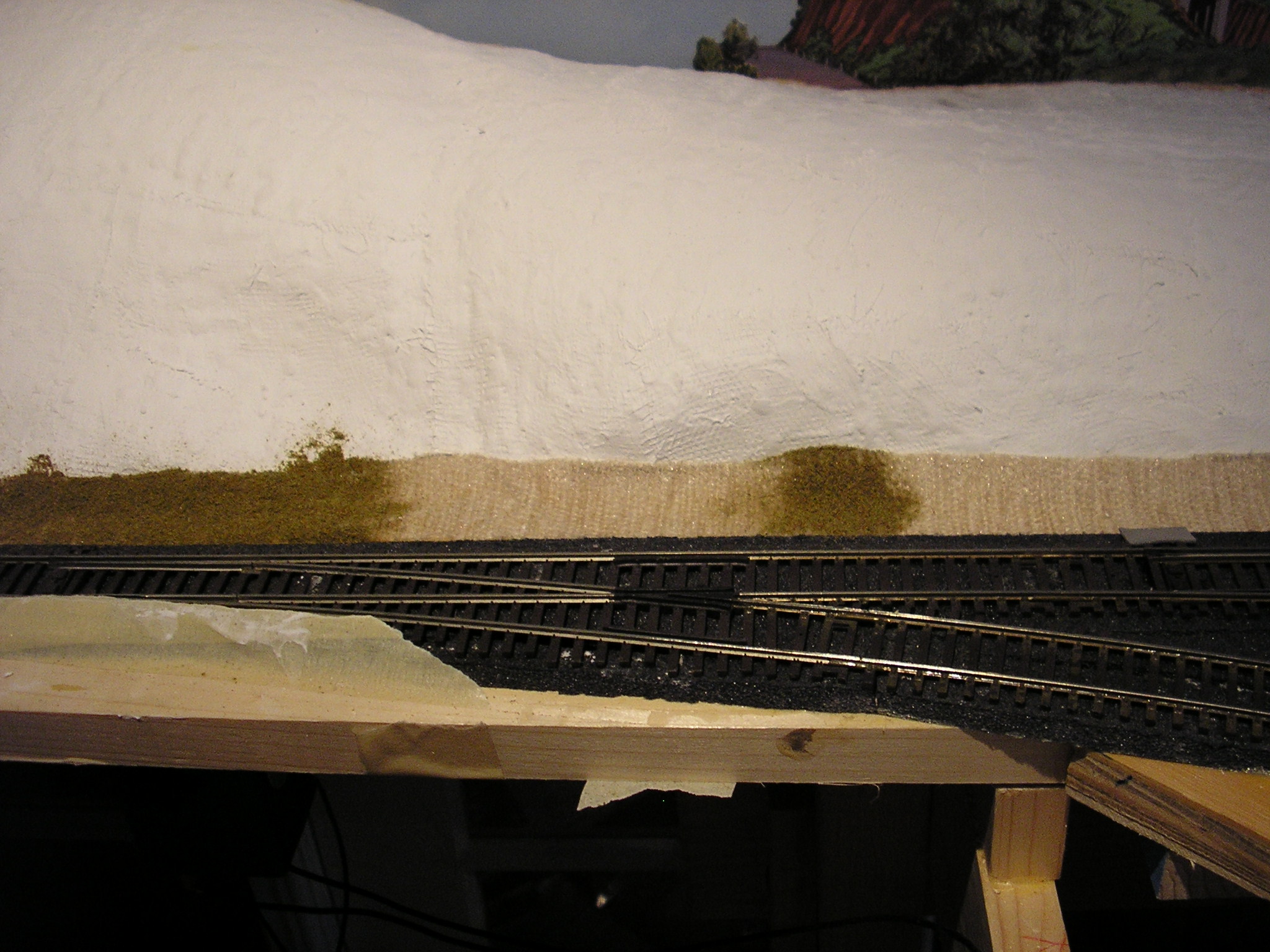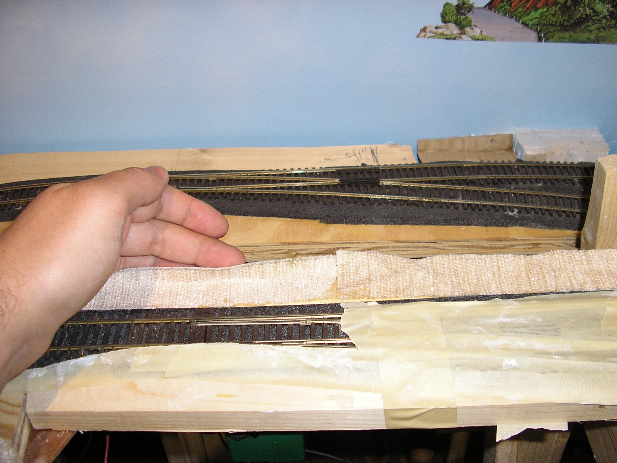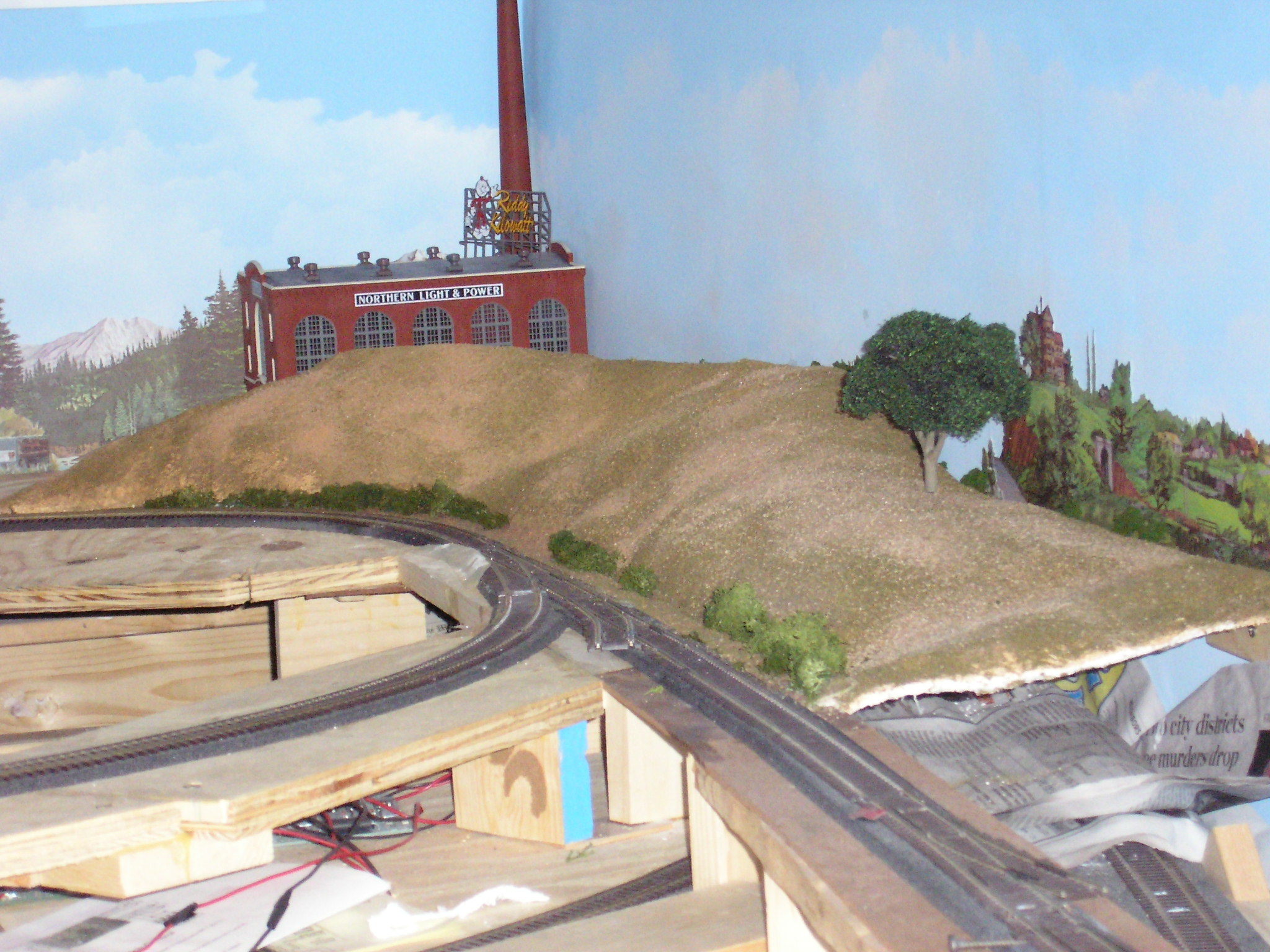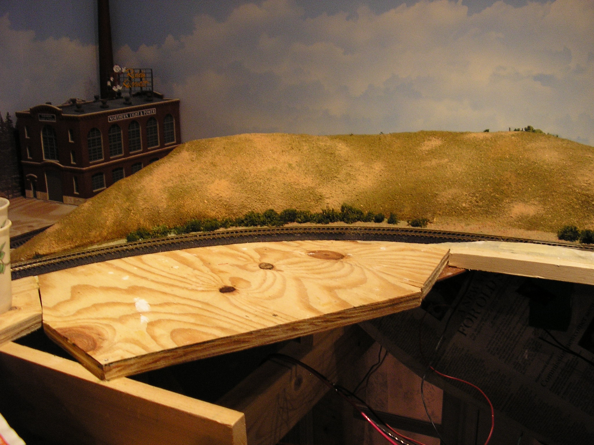 My layout has a hidden reverse loop (a reverse loop is when the track folds back into itself so that the train can return back where it came from). The reverse loop has little access unless I crawl underneath the layout, but there is a section that is covered by a small mountain feature that makes that portion of it inaccessible if it wasn't for the fact that the mountain itself is removable. What I basically did was to first create the mountain using wire-mesh and Woodland Scenics plaster cloth (several layers to make it strong), and I added a strong fabric border which I then covered with glue and then with ground foam and lichen covering to simulate bushes. The majority of the seam is right against the track so having the "bushes" helps to hide the seam. The other side not next to the track was later hidden the same way with the cloth and ground foam and lichen. The only difference was that I made the bush line a little wider. Once complete, the seams became undetectable. Below is a copy of the article and some pictures of how I went about the project.