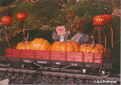 Two prize pumpkins on flat car. The eyes light in the