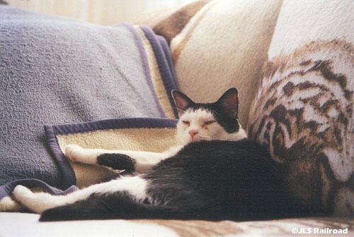 Another of our 5 cats, Bovine, getting into trouble on the layout