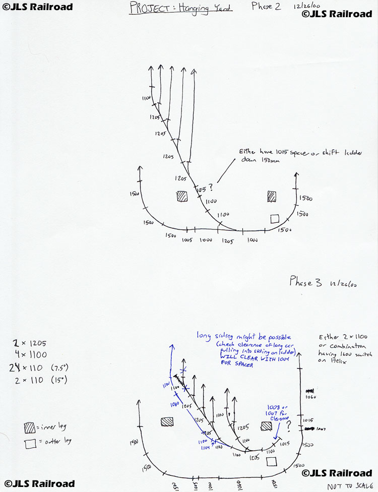 After measuring and on-site planning, the Hanging Yard's shape changed quite a bit from what I originally though it would look like. Phase 2 shows the original configuration of the ladder, however phase 3 proved to yield more trackage within the yard, although would be much more of a challenge to build.
