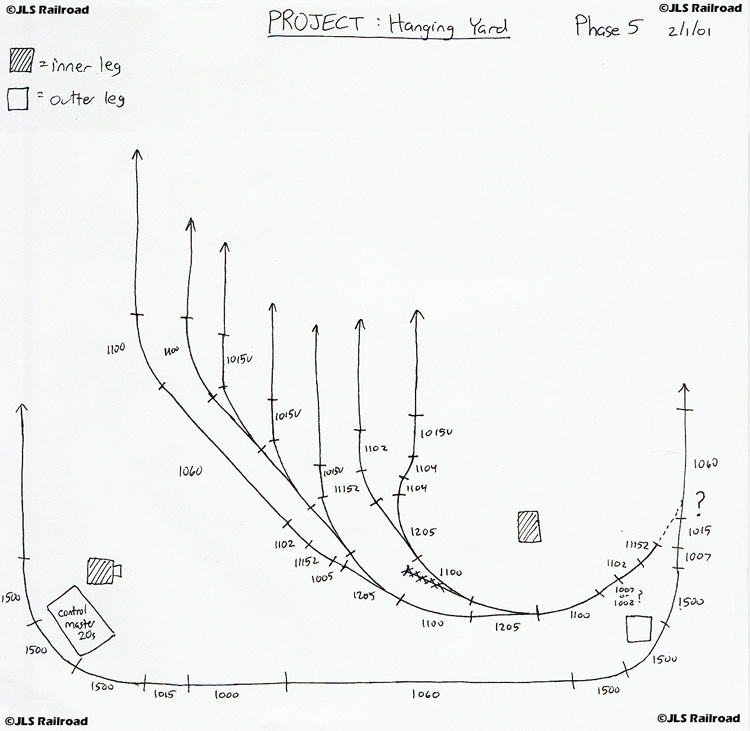 The final rendition of the Hanging Yard's track arrangement. The lead switch, which is continuous with the first tier of the Helix is still unknown. Surprisingly enough we were able to squeeze 7 long sidings in this very small area (thanks in part to the genius of Skip Densing). The lengths of the sidings have yet to be calculated as well, but should be on the order of 10 to 12 feet each.