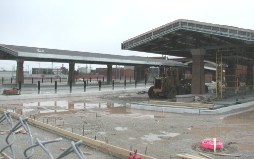 City of Racine and Findorff Construction continue striving for June 30, 2004 completion of the new State Street transfer hub for Belle Urban System buses, though exceptional rainfall of monsoon amounts in May has hampered much of the remaining work (see photo below). When complete and in full use, the center will serve regional and interstate buses beside BUS buses.
