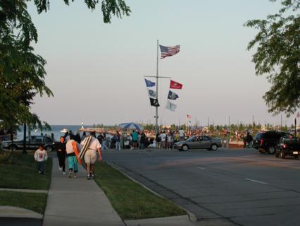 As supper hour faded toward 8:00 PM, 90 minutes before the fireworks display was due to start, every path eastward was busy with fireworks viewers finding their way to a favorite location overlooking Lake Michigan or the Kenosha harbor. Much of Harborpark, partly visible in the distance, teemed with families laying out blankets and chatting after riding east on one of three PCC streetcars circulating through the district.