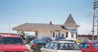 The former Sturtevant station was erected in 1907 (or earlier, according to some local historians) by Chicago, Milwaukee, St. Paul & Pacific RR at intersecton of its Southwest subdivision (the RSW) and Chicago & Milwaukee subdivision (C&M), busiest of them all. By mid-1990s, its former importance dwindled to mere shelter for passengers on trains pausing for fares paid to Amtrak, which paid owner Soo Line and its CP Rail parent a pittance for use of the station. For sheltering about 5 percent of riders in the Milwaukee-Chicago Hiawatha Service corridor. A bright 1999 summer day found it gleaming white beyond a parking lot full of about 60 cars, its threatened demolition stalled by local interest in its preservation.