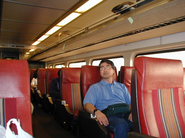 (62K) Railfan friend Les Higa inside Horizon Coach on Amtrak Pacific Surfliner #765. Already has ear bud connected up with his scanner. |