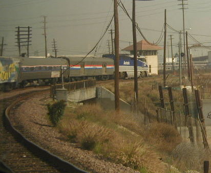 (42K) Amtrak Pacific Surfliner #765 rounding the tight curve at Redondo Junction passing Redondo Tower. By some time next year Amtrak (and Metrolink) will be using a new flyover (over the Alameda Corridor) and so this shot won't be possible much longer. |