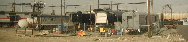 (60K) View of Amtrak facilities with Pacific Surfliner and Superliner Sightseer Lounge equipment visible. |