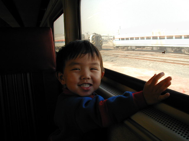 (50K) Andrew enjoying his trip past the Amtrak coach yard. |
