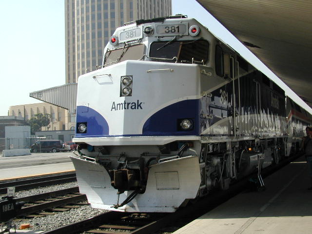 (60K) Front view of AMTK #381 F40PH in Pacific Surfliner paint scheme. |