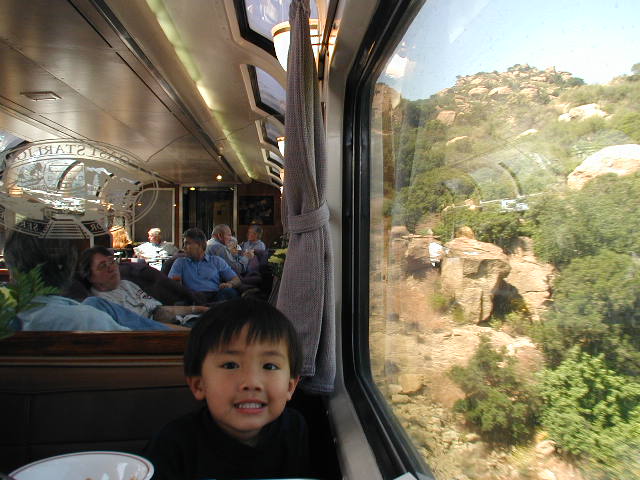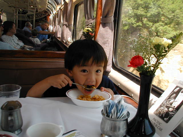 (67K) Nathan enjoying a bowl of Frosted Flakes in the Pacific Parlour Car (ex-Santa Fe hi-level lounge). |