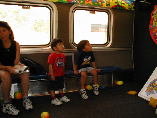 (60K) Andrew and Nathan in the Kiddie Car watching a video. Lots of toys to play with but just like Daddy they are glued to the TV. Nathan has the pose (mouth wide open) like I did when I was his age. Passing Simi Valley station. |