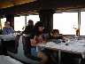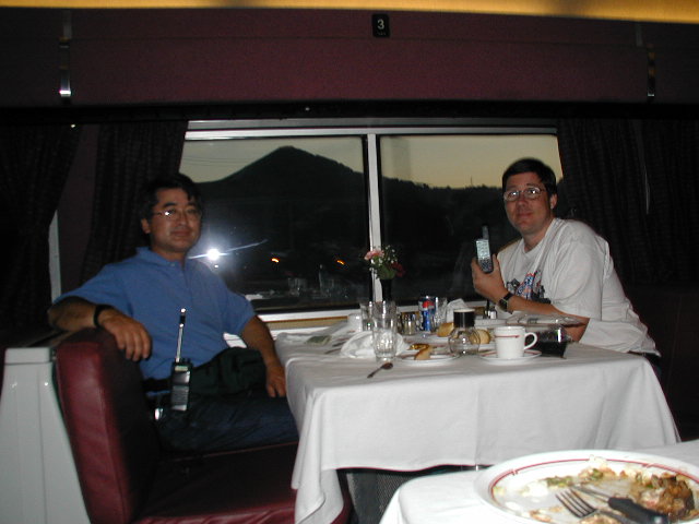 (57K) Les Higa and Steven Reynolds eating dinner in the diner fully equipped for railfanning; Les with his Radio Shack scanner and antenna, and Steven with his portable GPS unit. |