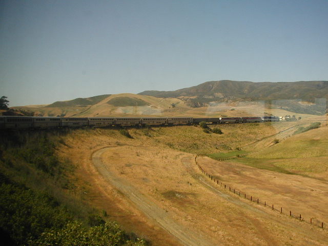 (56K) Shot of our train (taken from the last coach) rounding the Horseshoe Curve in Cuesta Pass just North of SLO. |