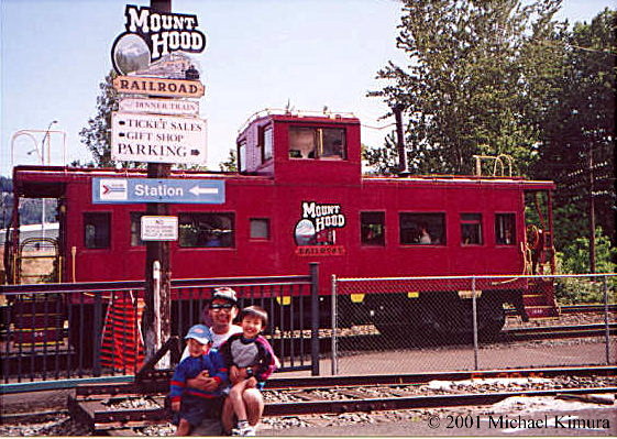 (95K) Scanned photo of Andrew, me, and Nathan in front of the Mt Hood Railroad caboose as we watched the excursion train depart. |