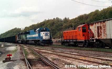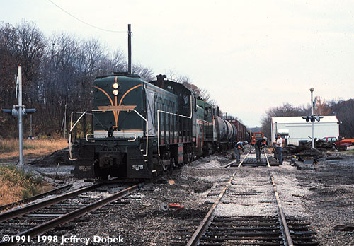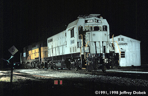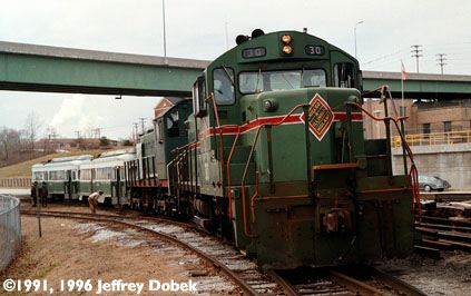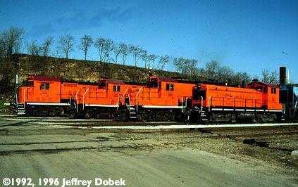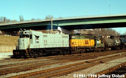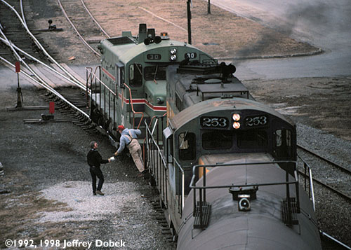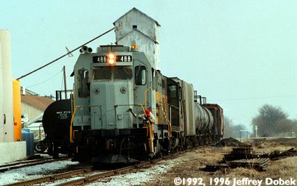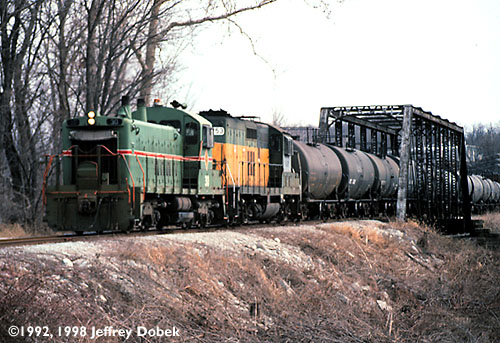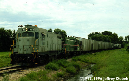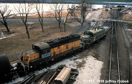 The KJRY re-equipped its locomotive roster in 1991-1992. The arrival of CF-7 #488 from National Railway Equipment (former Santa Fe #2488) allowed unusual lash-ups such as this with former C&NW HE-15 #253.(ex C&NW #4253). Once the units were tested, painting could begin. |