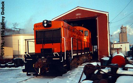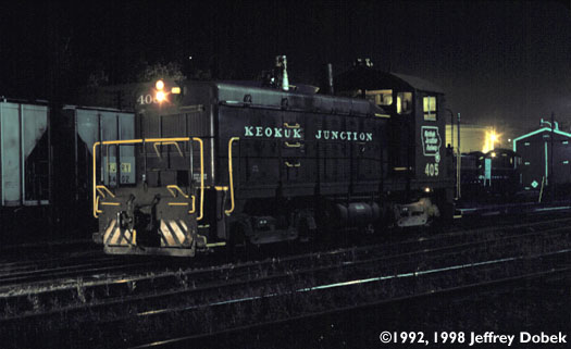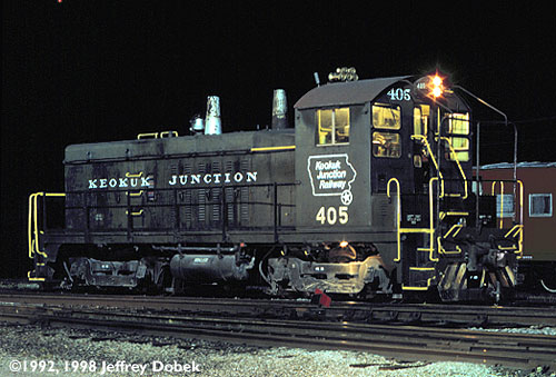 Switcher #405 was the regular engine in the Keokuk yard. Purchased from the Peoria & Pekin Union, it worked in P&PU colors (but with KJ lettering) until receiving orange in 1992. |