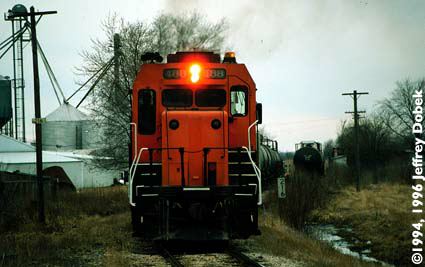 The "Rocket" was a CF-7 leased after HE-15 #253 was removed from service. The engine was ex-ATSF #2632 and owned by National Railroad Equipment. For a time it had been assigned to the Quad Cities Rocket dinner train and still bore the "Rocket" name on its side! |
