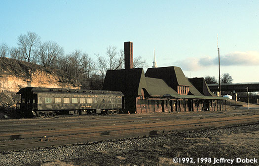 The "Chief Keokuck" catches the late-afternoon sun on the stub track next to the Keokuk Union Depot. The KJ purchased all the shares of the Keokuk Union Depot Company in the early 90's and carried out an extensive amount of restoration on the interior of the building. |