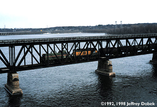 In the middle of the Mississippi, the train from LaHarpe maintains a 5 mile per hour speed limit. The Union Electric dam is visible in the background. |