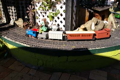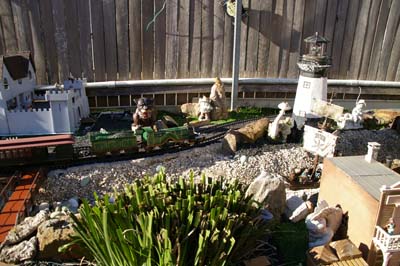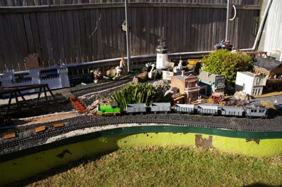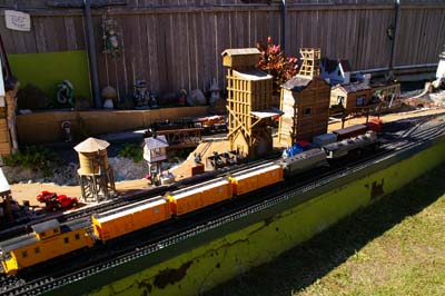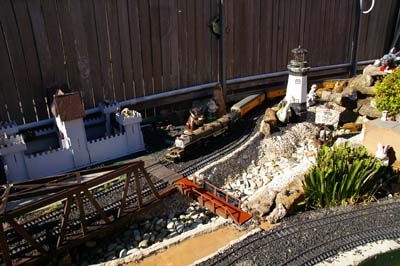 Doug's railway consists of a dual track main loop with a waterfall and river and overhead cable cars, a very nice layout.