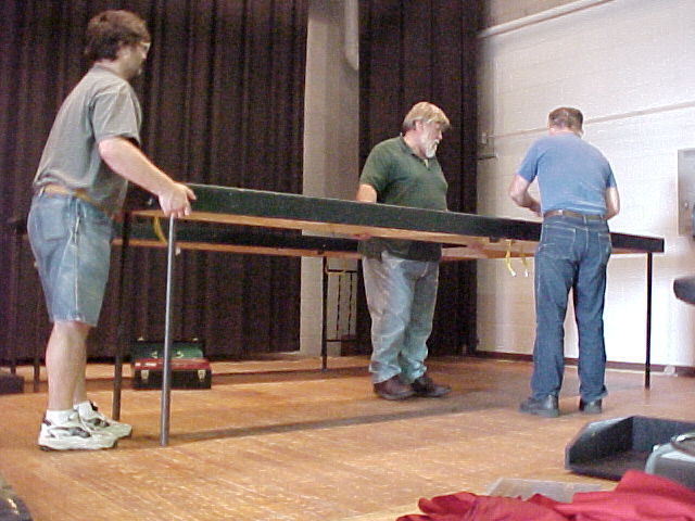 The end pieces each have four steel pipe legs, which screw into flanges mounted to the bottom of the layout. Four of the middle sections each have two legs and are supported by the adjoining section with bolts. The other two middles have no legs and are supported only by bolts. |