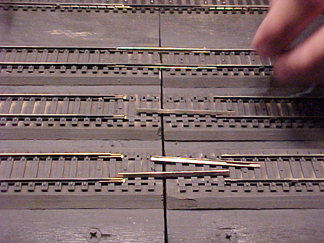 Where the layout sections meet, there are gaps in the rails, with special pieces that fit into them. These connectors are all the same length and interchangeable. They are held in place only by standard rail joiners. There are electrical jumpers underneath the layout so we don't have to depend on continuity through these joints. |