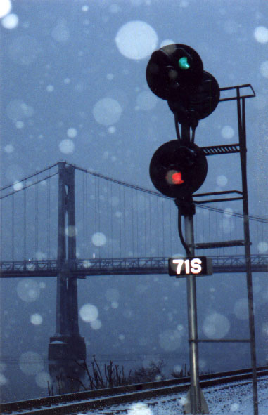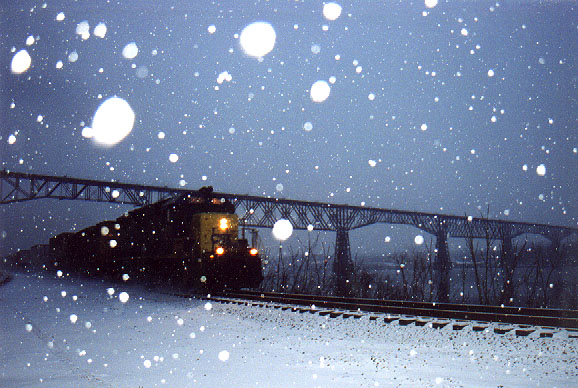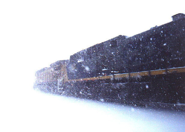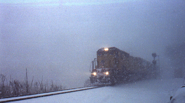 Heavy Snow, Winter 2000. UP C40-8 leads a CSX AC4400CW past MP71 on the River Line