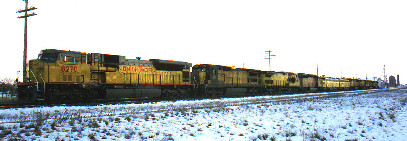 Ault Colorado Christmas Day 1999. 10 unit lite engines with the UP E9s 949 and 951 with 3 SD90MACs and 2 CNWs! UP 8270 SD90/43MAC, CNW 8516 8-40C, CNW 8654 9-44CW, UP 3836 SD40-2, UP E9 951 , UP E9 949, UP 8083 SD90/43MAC, CNW 8602 9-44CW, UP 8104 SD90/43MAC, UP 8068 SD90/43MAC. From south (8068) to north (8270)