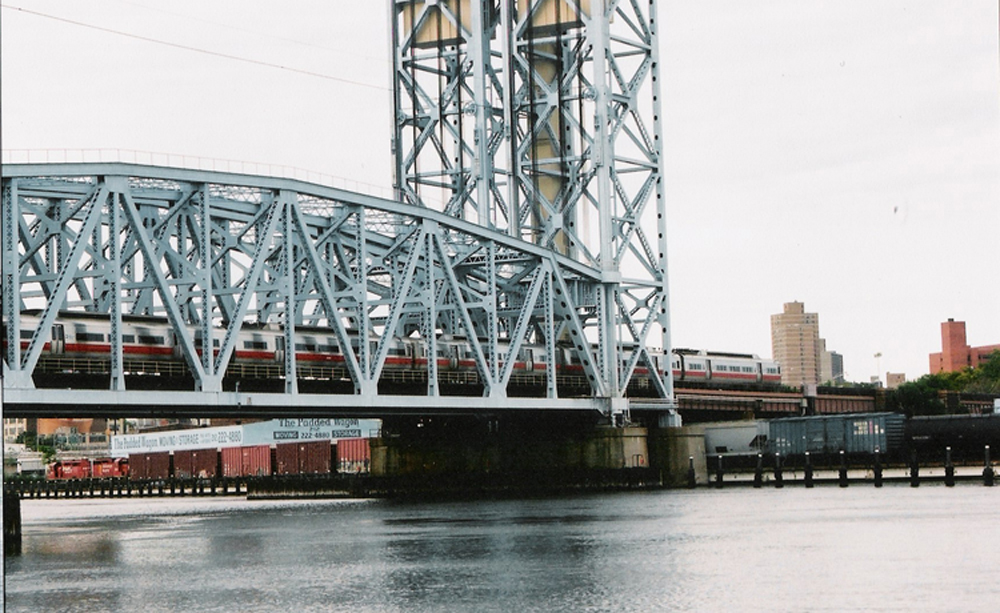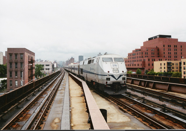 Illegal pictures: M7s on the Park Avenue viaduct August 6. 2004. My apartment is an old brick walk up just to the right of the tracks