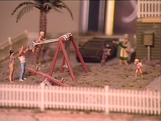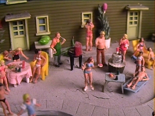 The scene includes swimmers, sunbathers, a family BBQ and even a scratch built keg. This scene is following the holiday theme and represents The 4th of July.