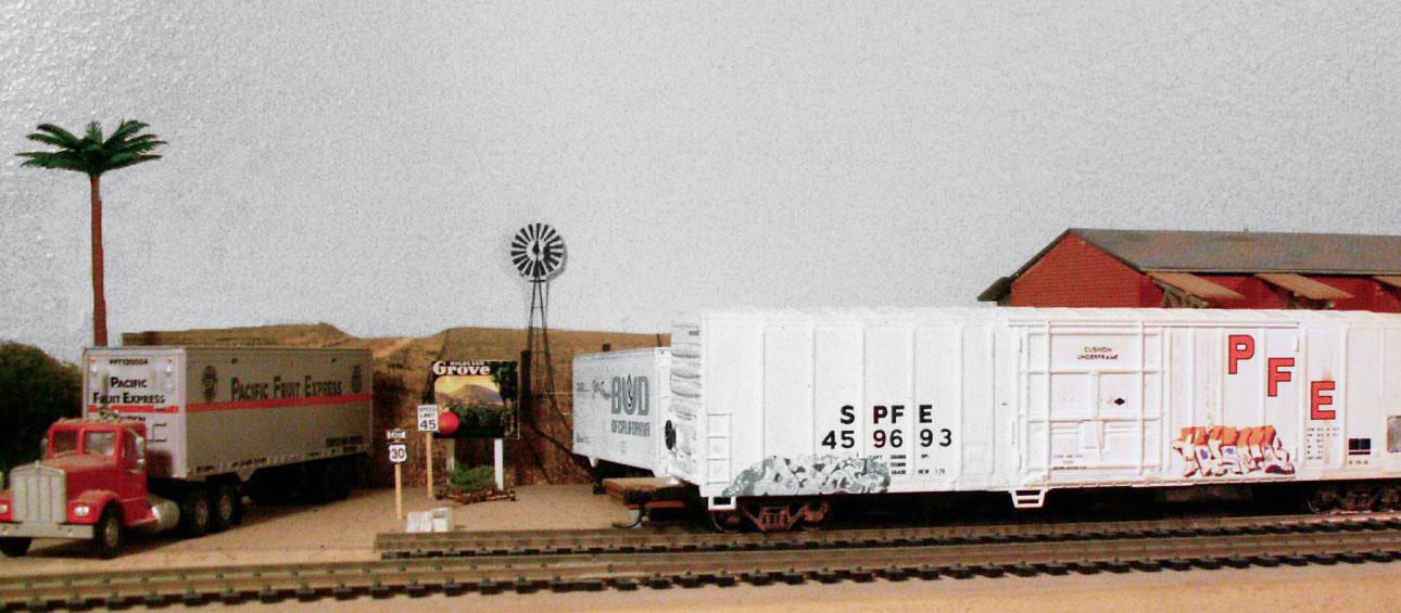 First I ditched the office section of the model and just used the warehouse part. I did however use the entire length of the loading platform to increase output up to three cars at a time. The building style looks very similar to the style of prototypes found in the Redlands and East Highlands area of California.