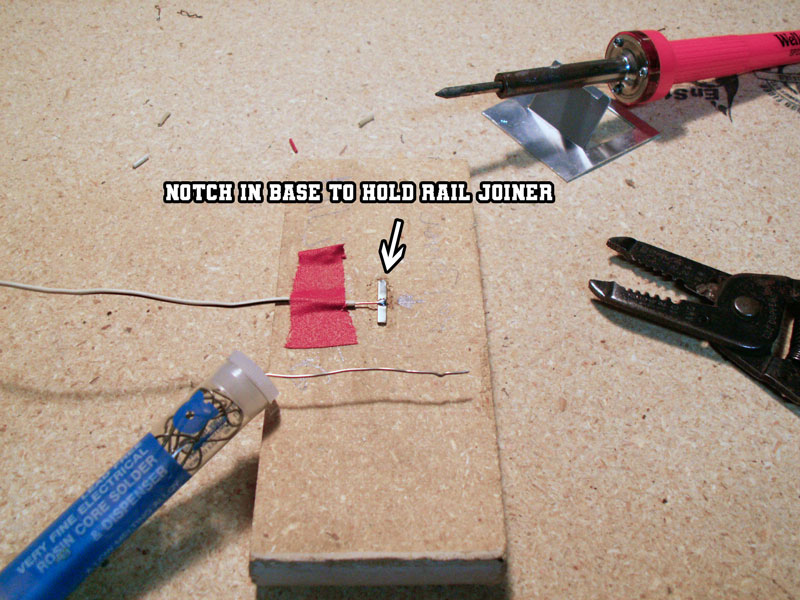 ![]() Make your own electrical feeder rail joiners by soldering (door) bell wire onto rail joiners. Doing it at the work bench makes it easier. Use a wood chissel to create a notch in a piece of MDF or other scrape of wood to cradel the rail joiner. Use a piece of tape to hold the wire in place while you solder the wire to the rail joiner. Ues two different colors of wire so you don't accidentally mix up the positive and negative wires. |