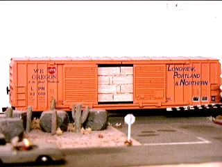 Over the years I have tried a variety of construction techniques. Some were published methods from books and magazines, and some were my own experimentation. Just like with everything else in life, you learn from your mistakes, then you try again. Some of my layouts were so made from trial and error that there are several different techniques used on the same layout. Notes are taken on what worked and what didn't work. And in the end, if you don't like what you made you can try it again. In the beginning there was 4'x8' plywood with a slot car race track on it. The plywood board was held up by two saw horses. One day the race track came down and oval train track with a siding and spur took it's place. This plywood tabletop would later become a main part of the first official layout. The oval was never meant to be anything other than a test track for the new HO scale equipment that I bought to replay my O scale, Lionel 0-27 carpet empire, toy train conglomerate, which I had amassed throughout my childhood. I have built hundreds of layouts with the big, three rail track, none of which my parents let last more than one day. It was very educational. Rebuilding the track every time taught me a lot about geometry and electricity. Anyway, the first two versions of the layout use what I call the cookie cutter, plywood, open grid, bridge the gaps between bookshelves method. Using this method I literally build the benchwork on top of old furniture, including bookcases, old TVs, desks, and dressers. This gave me lots of nice storage space under the layout and sturdy support. I would arrange the furniture in the shape of the layout and then bridge the gaps between the pieces with scrap plywood dimensional lumber, or even old doors. In some spaces traditional open bench work tables were built. In other places the cookie cutter technique was used on top of the plywood. I like building on top of plywood. I know some people despise it but I like the security it gives to everything on top of it. One locomotive crashing through thin scenery and hitting the floor is too many. The benchwork on the newest version of the railroad is the open grid type with the grid covered with plywood. In some locations the plywood is level. In other places the plane is tilted, just like the real geography of the area, flat but at an angle. Some times the track is flat on the plywood. Other times it is on risers like when the track elevation goes up faster than the natural slope such as where the roadbed raises up into the mountains. This is the back part of the layout between Wolf Mountain and Sand Mountain, above the staging yard. One aspect I like about using a plywood base is that it makes a good solid foundation for buildings and roads. If the plywood is sloped, then, just like in the real world, some cut and fill is required to level the lot for that new building. But before we get that far, let's go back to the start of scenery. Scenery: The first scenery method I tried was some kind of stuff in a box that you had to spread over wire window screen to make mountains. It looked kind of real, with no painting required but it was expensive and after it dried it would crack if the wire screen moved. Another mistake I made was using a large sheet of grass to cover open grid which had been cut on top to create the contour of the ground so it would not be flat. This was in the cattle ranch area of the first layout. One day a train derailed and crashed through the grass and didn't stop until it got to China (the floor). Talk about the Orient Express! Since then I've tried the foam, and the plaster bandages and discovered that for mountain and desert landscapes, paper towels dipped into patching plaster, or plaster of Paris, works the best. The paper towels and plaster can create wonderful details that look great naturally without needing mountains of trees, ground cover or even paint to hide it. First I start by making mountain peaks using the empty cardboard rolls from paper towels and Christmas paper. I tape them down to the plywood to hold them in place. Next I make the skeleton with one inch wide strips of old cardboard boxes. I hot glue them to the mountain peaks and to the side of the elevated roadbed and to the bottom plane. I connect them together with cross pieces so that there is support for a single paper towel between the framing. I mix the plaster in an old pie pan, usually from King's Hawaiian bread. I just work on one little section at a time because you have to work fast before the plaster dries. Then mix up some more and do the next section. Always completely clean the pan between patches. You can do several sections in one day. This is my favorite part of construction and the most dreaded. It's a sloppy mess but once it dries you have an instant winter wonderland! Next I paint the earth that I want to not be covered with snow. Don't use brown! Unless you are modeling a mud puddle brown is too dark. Depending on soil content and moisture, the Earth is actually closer to a flesh tone. I think the swatch I picked out was call Jaguar. I use flat, water based, latex paint bought by the gallon from the hardware store. I mix water with it to thin it some and paint the ground from the bottom up, slowly making the snow line recede. If some paint runs down the side of a mountain and covers part of a freshly painted road below, that's run off. The best mudslide I ever modeled was totally by accident because it naturally ran down to the low points and caused some area flooding, leaving a nice mess for the city road repair crew to deal with as it filled one foothill area street intersection with mud. While the paint is still wet I sprinkle on some Lifelike brand 'Earth'. These small pieces of stained saw dust make an ideal ground cover for the most barren parts of the desert and mountains (other than dry lake beds which get a fine powder cover). Later fine size green ground foam is added to some areas. In low elevations c