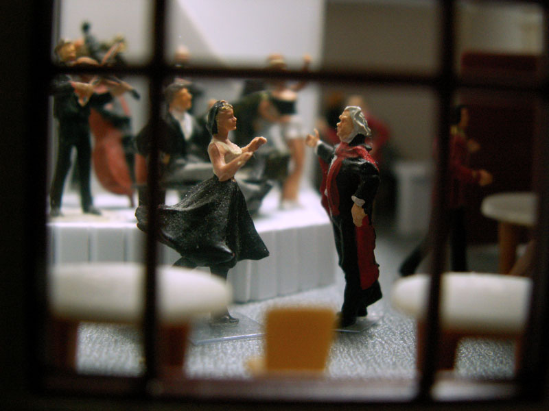 Violin, string bass, trumpet, clarinet, saxaphone and piano play along with the singing duet.