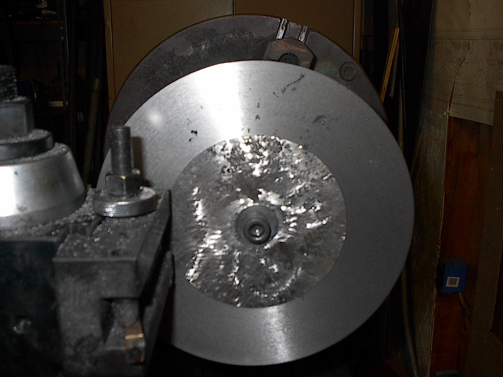 The wheels are cast out of grade 30 cast iron. They were placed in the 3-jaw chuck and the front (outside) faced off and the counterweight set out a little over .25 inch to allow truing after the back was trued and cut to thickness. The axle hole was also reamed before it was removed so that the face was true with the axle hole. Then I placed the wheel on a mandrel to face the back. Then turned it around on the mandrel and finished the thickness .875" and cut the tread