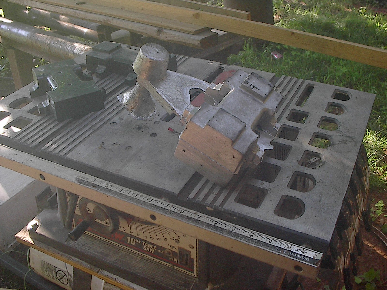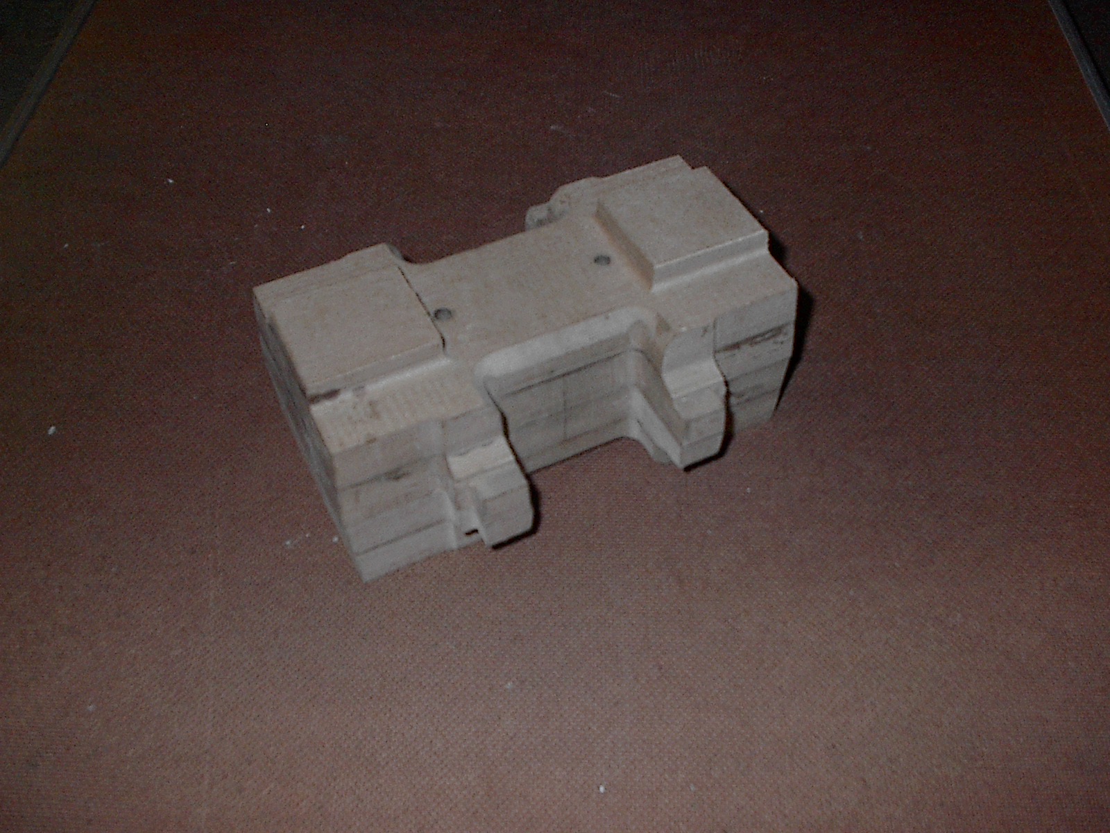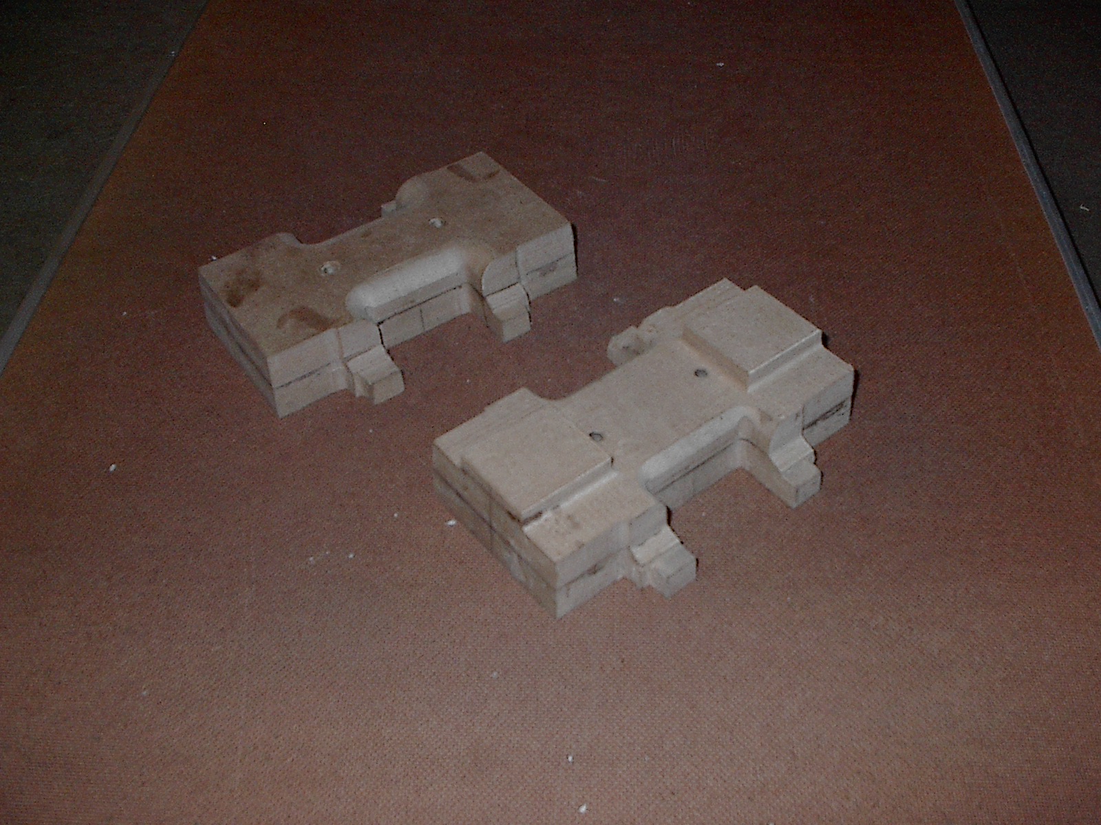 This is the pattern for the axle boxes they will be cast out of aluminum the first picture is the two halves. I placed half the mold and the pouring cup on a piece of ply and rammed the sand, turned the drag over, removed the ply but left the mold half and cup in the sand , covered it with wax paper pinned the other mold half and runner and rammed up the cope