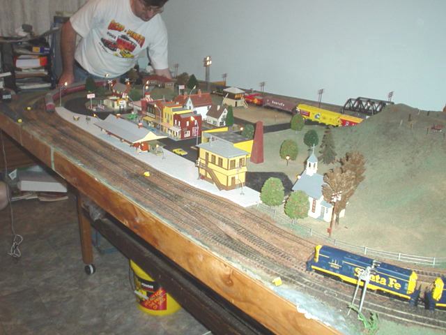 made overbridge and tunnel. From that 1st introduction to model railroading, I caught the bug. Next birthday a Santa Fe GP20 arrived, and later some Amtrak Passenger cars that set the scene for me selecting the early 1970´s as my era. The layout grew to two ovals and a siding. Buildings sprung up along the road way, and more and more freight cars were purchased with my pocket money savings. By the mid 80s the layout still 4 x 8" was now a busy little town, and I worked with dad to extend the layout by a foot on each side to form 6 x 8 feet. Along the outside of the main line I had loco facilities and a tram way that horse shoed around the main line and down the new busy main street. This layout lasted until the late 80´s when finally the chipboard in the baseboard gave way, and layout #2 was under construction. The new layout had a solid pine frame and 12mm ply baseboard, again 4 x 8", but this time a lot of planning went into the track design, which accommodated longer trains, an entire mountain side and small township with several busy railroad industries. Still all dc powered, there were carefully designed track blocks, signalling and electrified turnouts throughout. The problem I had however was my ever expanding multitude of trains was outgrowing the layout. I maintained this layout until 2003 when I sold it to my good friend Alan. Layout #4 is currently being designed ready for