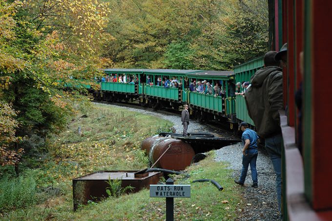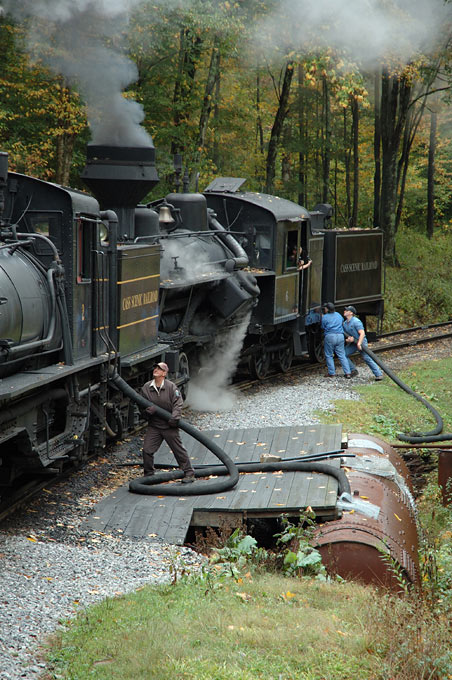 Logging locomotives have the ability to take on water through hoses from streams or other natural sources when a water tower is not available.