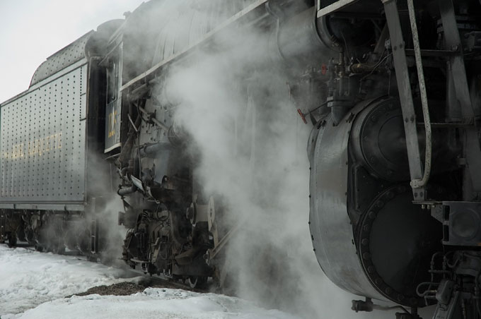 The steam locomotive makes for an especially impressive sight in cold weather.